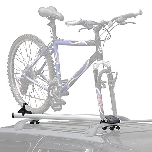 BC-219 Aluminum Roof Bike Rack. Fork mount bike rack attaches to roof crossbars to easily carry a bike on a vehicle roof. The BC-219 roof bike carrier has a sturdy yet Light-weight aluminum construction. Fits up to 50" bicycle wheel base. Overall 2.75"W x .5"H maximum crossbar size. Minimum height of 1.5" required from underside of crossbars to roof. Minimum distance of 15.75" required between two roof crossbars.